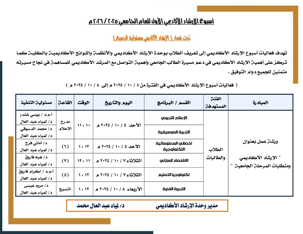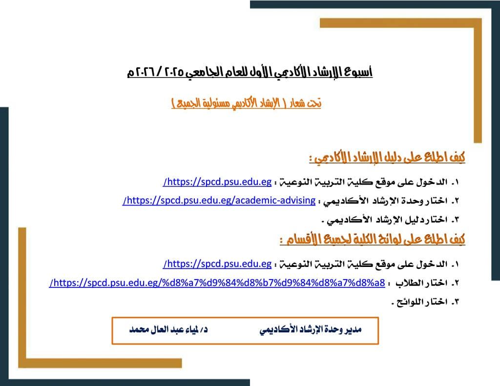 تحت رعاية معالي الاستاذ الدكتور شريف صالح رئيس جامعة بورسعيد ، دعوة عامة لجميع السادة اعضاء هيئة التدريس والهيئة المعاونة وابناءنا الطلاب بكلية التربية النوعية ببورسعيد للمشاركة في أسبوع الإرشاد الأكاديمي الأول للعام الجامعي ٢٠٢٥ / ٢٠٢٦م