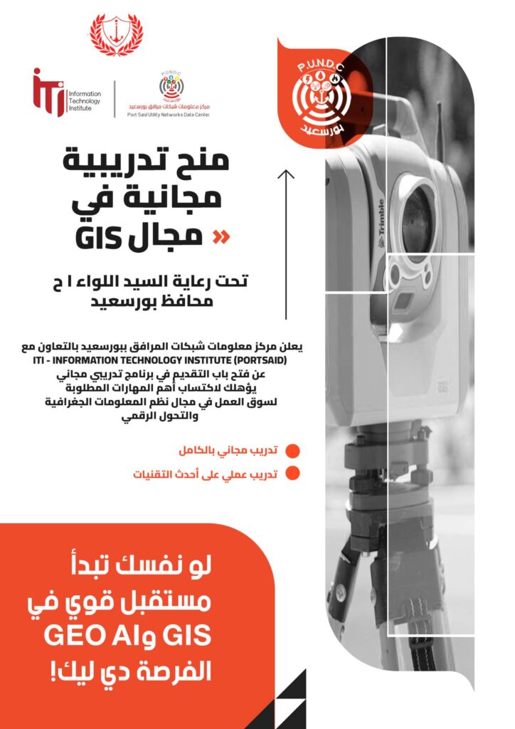 برعاية السيد اللواء ا.ح محافظ بورسعيد،يُعلن مركز معلومات شبكات المرافق ببورسعيد بالتعاون مع ITI – Information Technology Institute (Portsaid) عن فتح باب التقديم في برنامج تدريبي مجاني يؤهلك لاكتساب أهم المهارات المطلوبة لسوق العمل في مجال نظم المعلومات الجغرافية والتحول الرقمي. إيه اللي هتتعلمه؟• أساسيات الـ GIS والاستشعار عن بعد.• التعامل مع البرامج العالمية: ArcGIS […]